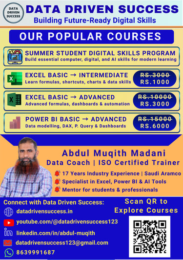 Advanced & complex formulas, Power Query automation, AI-assisted Excel techniques, professional dashboards & real company Excel scenarios for college students and working professionals.